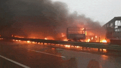 当日上午10时20分现场明火被扑灭,经初步调查,现场3起交通事故均因团雾天气及长下坡桥梁结冰等引发。