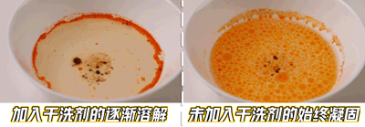 之后就会发现,👈喷了杜邦干洗剂的那一碗油已经不挂壁了,水也慢慢开始变色。