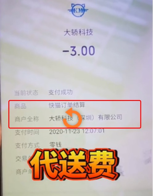 而记者关注到,在网友@锅里有东西 的报料视频最后,外卖员给代送人员转账界面显示:商品名称为:“快猫订单结算”,商户为“大轿科技(深圳)有限公司”。