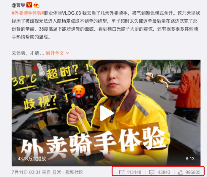 微博博主@曹导 发布视频记录了自己当外卖小哥的经历。