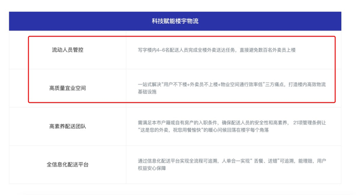 高质量宜业空间:一站式解决“用户不下楼+外卖员不上楼+物业空间通行效率低”三方痛点,打造楼内高效物流基础设施。