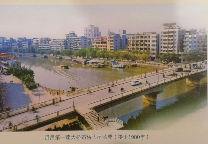 1973年11月5日,为沟通城乡经济,保证全县南北畅通,县委决定兴建市桥大桥。因那些年物资奇缺匮乏,施工进度缓慢,历经7个寒暑,大桥才得以竣工。据番禺县志记载,1980 年10日1日,首座横跨市桥河南北的桥梁,市桥大桥建成通车。该桥主桥134米,引桥180米,桥面宽7米。市桥大桥谱写了番禺大兴桥梁建设史的头一页。