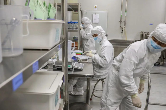 工作人员在配液间工作。