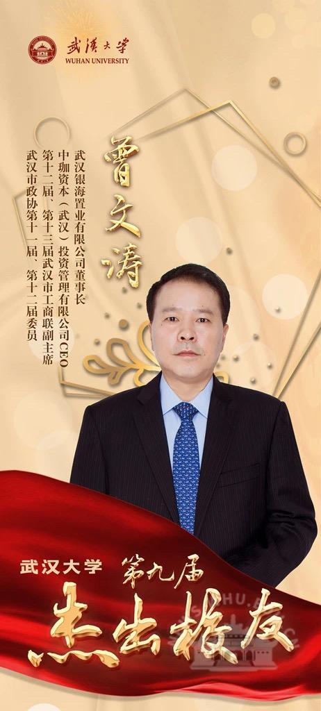 曾文涛,男,1963年7月生。武汉大学1994级政治经济学专业博士。武汉银海置业有限公司董事长,中珈资本(武汉)投资管理有限公司CEO。第十二届、第十三届武汉市工商联副主席,武汉市政协第十一届、第十二届委员。作为武大校友企业家联谊会抗击新冠肺炎疫情应急小组组长,曾文涛一直战斗在武汉战“疫”第一线,不仅自己捐赠款物支持抗疫,还为捐赠物资采购殚精竭虑,做了大量具体、细致的工作。曾文涛关心学校发展,在支持学校发展建设方面做出重要贡献。