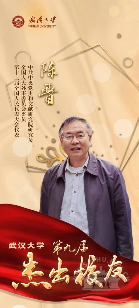 陈晋、程亦凡、蹇宏、毛明、阮立平、喻鹏、曾文涛、朱征夫等八位校友(以姓氏拼音为序)光荣当选武汉大学第九届杰出校友。校领导韩进、窦贤康、万清祥、吴平、李建成、赵雪梅、唐其柱出席活动。往届杰出校友陈东升、喻杉、毛振华、周旭洲等与来自全国各地的校友代表,以及学校院系和职能部门负责人、学生代表共同见证了颁奖仪式。