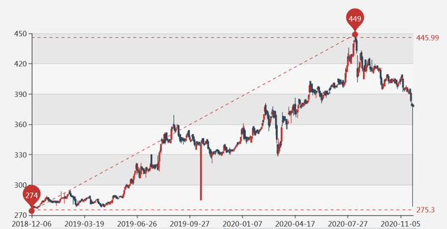 11月26日,伴随原油、黑色系等商品价格上行,国内期货市场上沪金主力合约再度走跌。从8月7日最高454.08元/克到近期最低378元/克,国内黄金期货价格三个多月来累计跌幅近17%。
