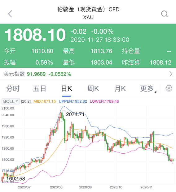 11月27日,中行网站刊出黄金市场分析指,上个交易日恰逢感恩节,市场交易清淡,黄金价格几乎没有波动,仍然维持在1800上方。