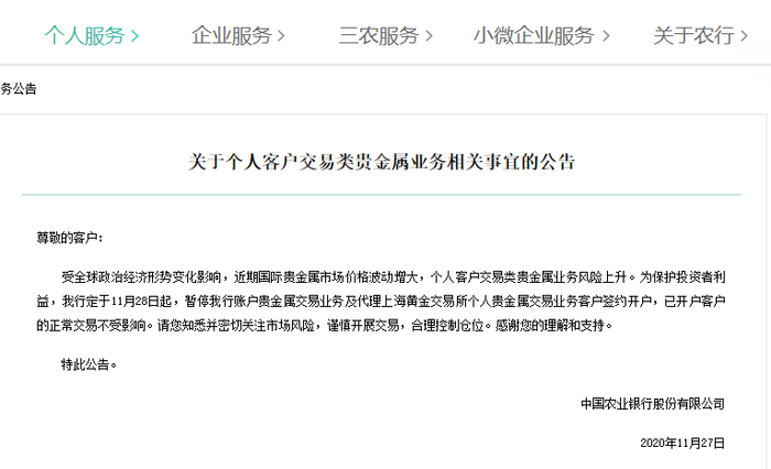 农业银行称,受全球政治经济形势变化影响,近期国际贵金属市场价格波动增大,个人客户交易类贵金属业务风险上升。为保护投资者利益,我行定于11月28日起,暂停我行账户贵金属交易业务及代理上海黄金交易所个人贵金属交易业务客户签约开户,已开户客户的正常交易不受影响。请您知悉并密切关注市场风险,谨慎开展交易,合理控制仓位。感谢您的理解和支持。