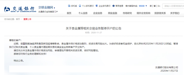 交通银行称,近期,受国际政治经济形势及新冠疫情等影响,贵金属市场价格波动剧烈,投资交易风险加大。为做好投资者权益保护,自北京时间2020年11月28日12:00起,暂停我行记账式贵金属、个人贵金属代理延期交易和满金宝业务新客户开立账户。