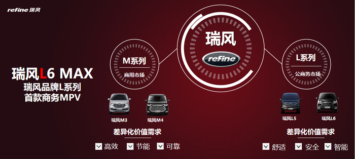 在现有产品矩阵的基础之上,瑞风品牌衍生出M、L两大产品系列。全新推出的瑞风“L”系列侧重中高端商务出行的产品用途和高品质的产品体验,将助力瑞风向更高层级的多场景的出行领域发起冲击。以瑞风M3、瑞风M4为代表的现有MPV产品组成瑞风“M”系列,更注重载人载物的空间实用性与燃油经济性,今后将专注于商用及兼用型市场,充分满足商用客户高效、节能、可靠的价值需求。