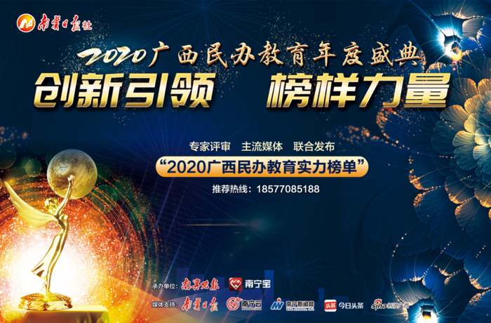 为鼓励更多的优秀人才和学校推动广西教育教学迸发更大的生机与力量,促进学校的创新与进步,南宁日报社将以巨大的影响力、强势传播资源,打造极具影响力的“2020广西民办教育年度盛典”年度荣誉盛会。