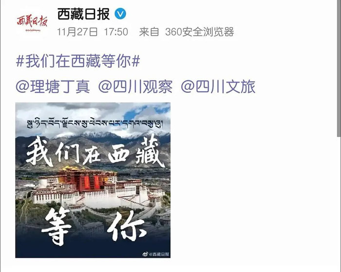 随后,“西藏日报”官方微博很快“调皮地”回应:“我们在西藏等你。”