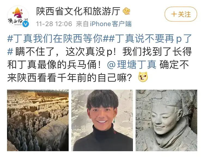 #陕西文旅连夜打手电进坑找的兵马俑##丁真撞脸兵马俑#纷纷上了热搜。