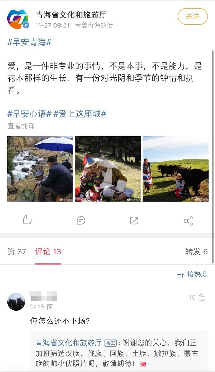 青海有点特别,它刚开始悠哉悠哉,发着岁月静好的早安心语,它是不急,但网友急了,直接“催下场”了。