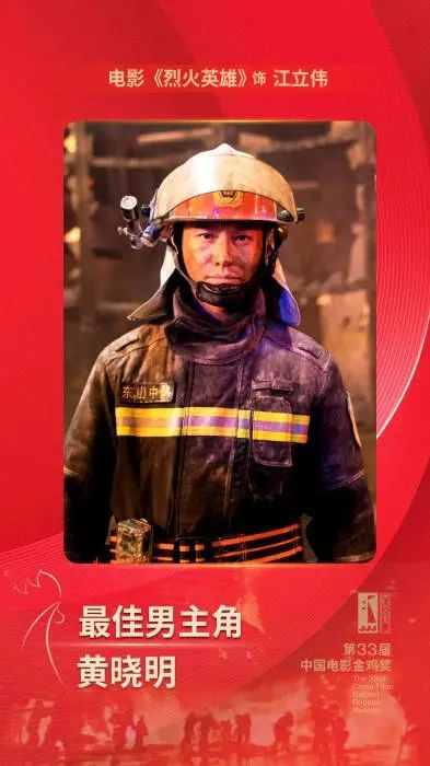 其中,黄晓明继《中国合伙人》后,再获金鸡奖。他表示自己压力很大,因为有越来越多优秀的演员。除了感谢家人、恩师外,黄晓明还特别感谢了消防英雄,“没有他们日常守护和牺牲就没有我们的幸福生活,这个奖是属于消防英雄的。”