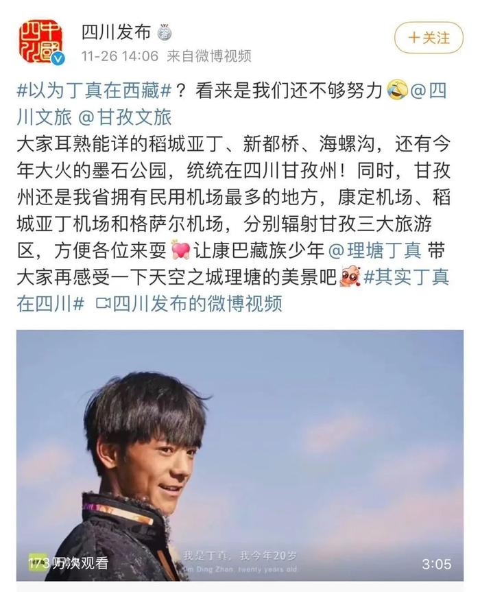 11月中旬,因一段“野性与纯真并存”的短视频,四川省甘孜州理塘县藏族小伙丁真在社交媒体爆红。之后,他成为家乡理塘县文旅体投资发展有限公司的员工,为当地文化旅游代言。25日,理塘旅游宣传片《丁真的世界》上线,格聂雪山直插云端、高原草甸一望无垠,藏族少年纵马驰骋……丁真再次引发全民关注。