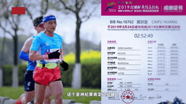 在近期举办的绍兴马拉松上,他以2小时58分28秒,排名70-74岁年龄组第一。而在去年3月无锡马拉松上,他的成绩更好——以2小时52分49秒打破日本人保持的65-69岁全马亚洲纪录,和68岁年龄组世界纪录只差1分47秒。