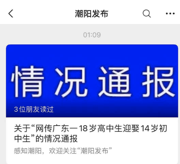 原标题:广东18岁男生娶14岁女生?官方通报来了