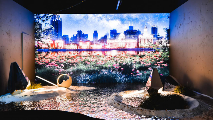 此前,该系列的其他作品已在海外社交媒体上收获上千万点赞,本次展出的《福流奇境》更特别以上海为主题设计。背景板上,是外滩、南京东路等地标的三维影像,前景则是青翠欲滴的草坪和树木,配合空间内以特殊材料营造的河流效果,让五光十色的城市建筑犹如从大自然之中拔地而起。随着影像的不断推进,城市与自然景观同起同落,建筑似乎也如植物一样有了生命。