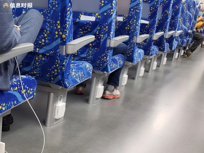 在车厢里,记者观察到,车厢座位布局为2+2布局,最大载客量可达1427人,车内座位随意坐,列车每排座位下有充电插座,手机可免费充电。