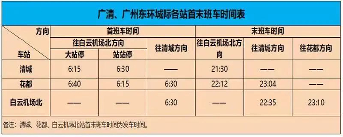 广清城际、广州东环城际采用"清城-花都-白云机场北"贯通运营,每天6:15清城站往白云机场北站方向开行1列大站停列车(中间站仅停花都站),其余列车均采用站站停方式。广清城际最高速度200公里/小时,广州东环城际最高速度160公里/小时。清城站至花都站大站停单程旅行时间约16分钟,站站停旅行时间约33分钟;花都站至白云机场北站大站停单程旅行时间约14分钟,站站停旅行时间约21分钟。