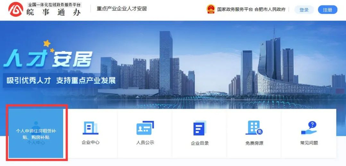 申请人注册安徽政务服务网统一认证实名账号,登录合肥市重点产业企业人才安居平台。或直接登录“合肥市重点产业企业人才安居平台”网址:http://112.30.184.211:8088/talent。