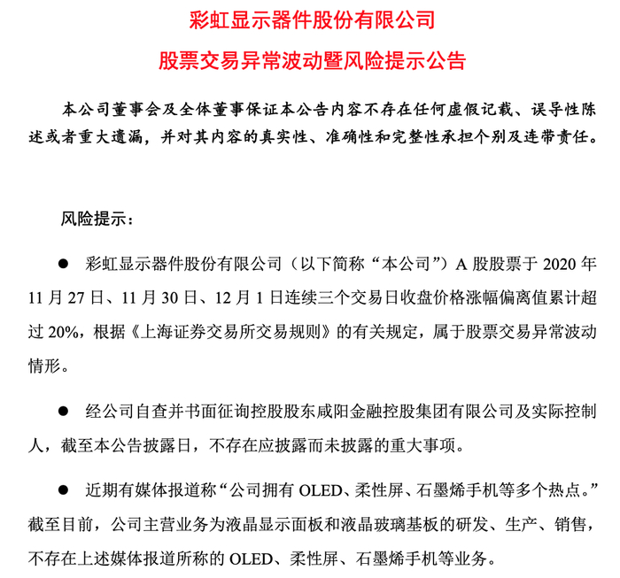 五连板彩虹股份澄清:公司不存在OLED、柔性屏、石墨烯手机等业务