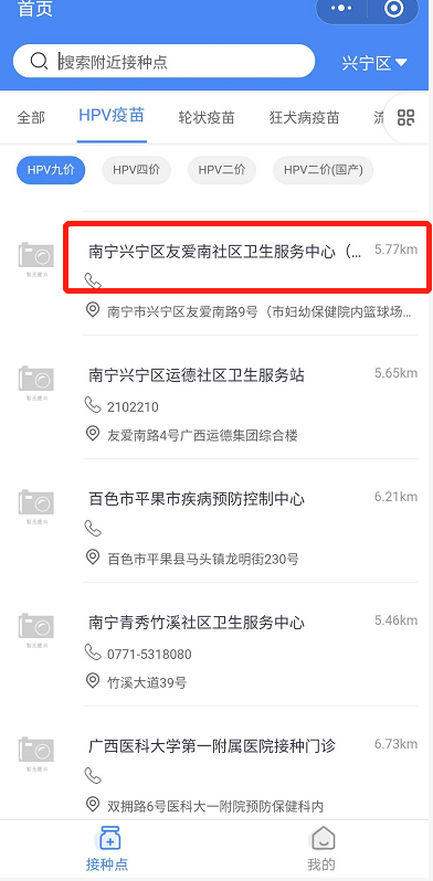 提示:成功预约在南宁市疾病预防控制中心门诊部进行首针接种的,其余二、三针次不需再次预约,只需凭首针接种时发放的接种卡在规定接种时间到门诊即可进行接种。在其他接种单位预约接种的,接种第二、第三针次时需再次进行预约。