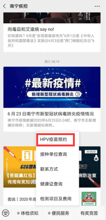 市民可通过微信公众号【南宁疾控-便民服务-HPV疫苗预约-选择接种单位-选择四价\九价】预约。