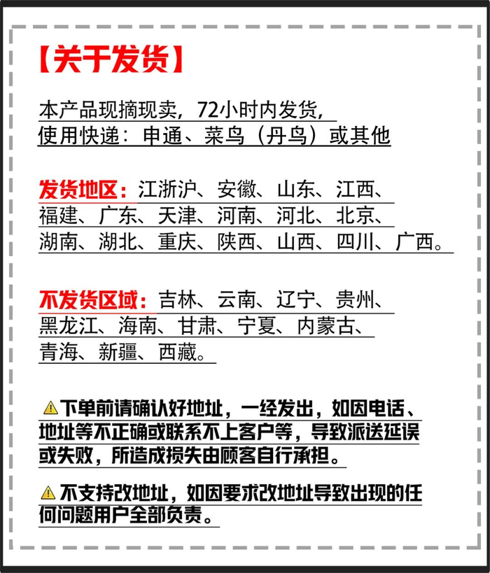 因为是新鲜农产品,运输过程中难免出现不可控因素,务必跟大家强调一下发货和售后的问题:
