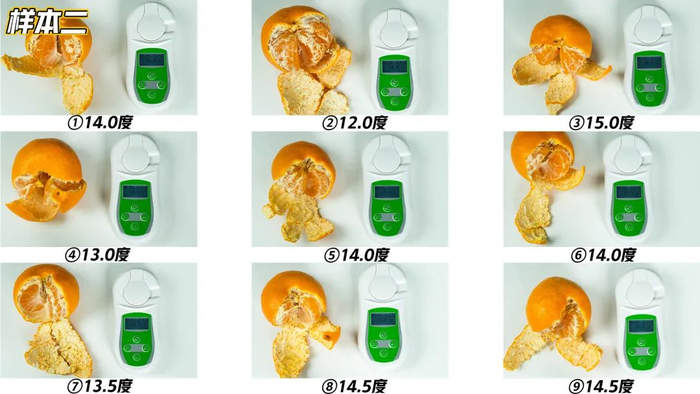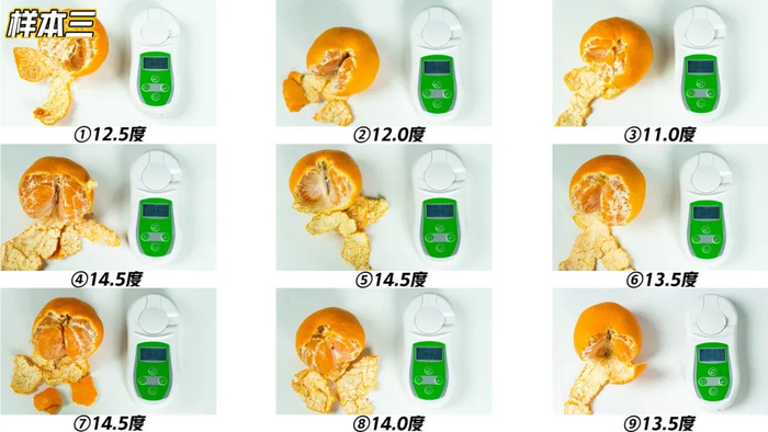 特意拆了一箱包装好的蜜桔,用甜度仪挨个测了甜度:27个橘子,甜度基本在12.5度以上,个别甜度还能达到15度,比蜂蜜还要甜!