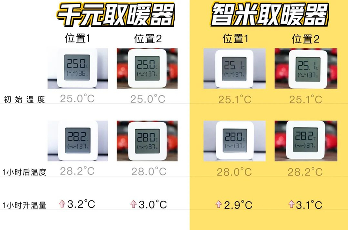 相同环境和位置下,两款取暖器在1h内的升温效果不相上下,都大约升温了3℃,整屋制热也都比较均匀,但智米取暖器却要便宜近1千块钱。