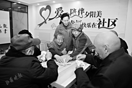 11月25日下午,在太原市尖草坪区光社街道建工街第二社区党群服务中心的一楼日间照料室,老人们正在兴高采烈地玩着扑克;二楼舞蹈室里,模特队的队员们正在紧张排练。