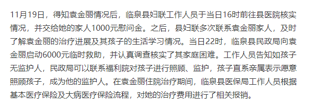 此外,临泉县红十字会及时为袁金丽和孩子开通爱心账户,截至11月25日,已收到2万余元爱心捐款。“这些爱心捐款,将在社会监督下全部用在孩子身上,供他上学以及生活。”临泉县红十字会工作人员说。