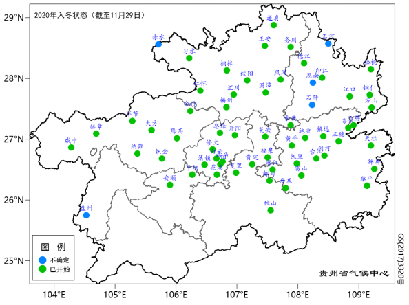 今年贵州省入冬时间除个别县(市、区)较常年(1981-2010年)偏早或偏晚外,大部分地区与常年入冬时间相当,全省最早入冬的地区为威宁10月16日,其余尚未入冬地区(含无冬区)的常年入冬时间在12月中上旬。