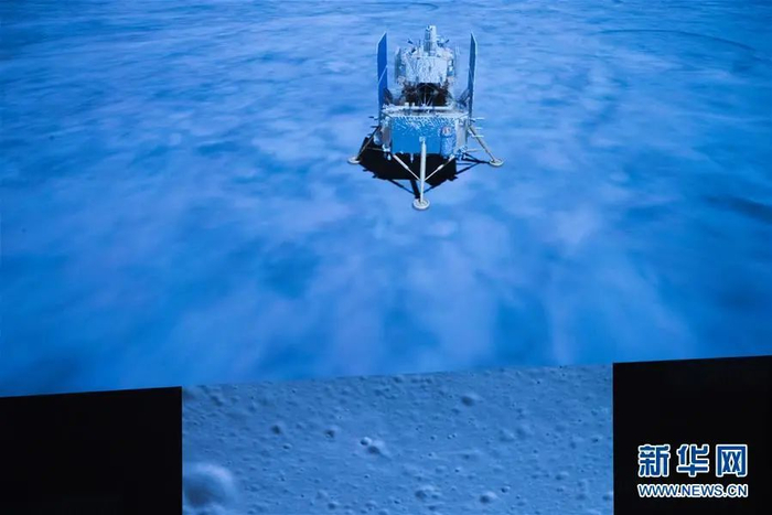 期间,探测器进行快速姿态调整,逐渐接近月表;此后进行障碍自动检测,选定着陆点后,开始避障下降和缓速垂直下降,平稳着陆在位于月球正面风暴洋的吕姆克山脉以北地区。着陆过程中,着陆器配置的降落相机拍摄了着陆区域影像图。