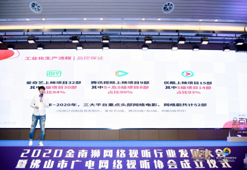 现场佛山市文化广电旅游体育局局长陈新文、佛山市广电网络视听协会会长王建章等领导悉数到场,并邀请阿里文娱优酷、新片场、淘梦、奇树有鱼、项氏兄弟等视频平台、头部网络影视公司负责人展开研讨,根据“网络电影理性增长期的升维路径”主题,新片场CEO尹兴良在盛典现场发表了主题为《终局思维,数据驱动下的网络电影》的演讲。