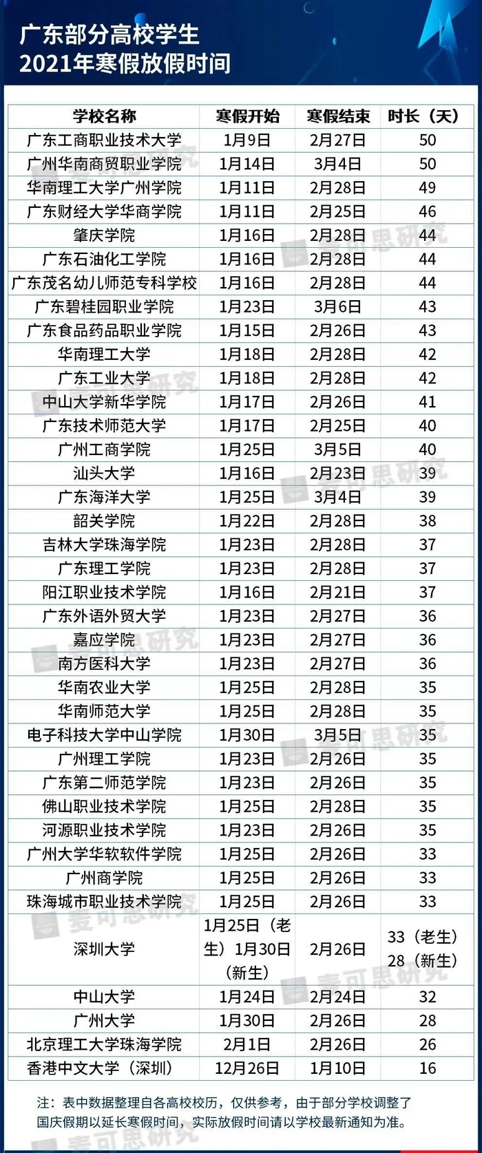 原标题:最长50天!广东部分高校寒假时间公布