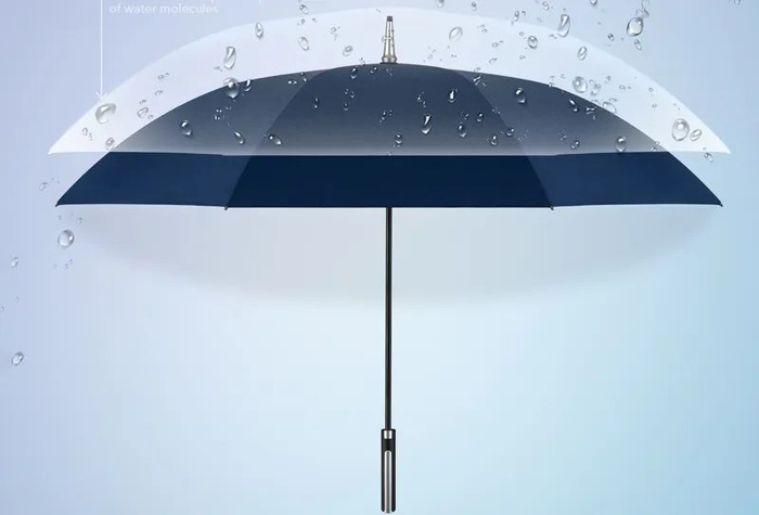 疏水材料的空间结构在伞面形成空气层,雨滴落在伞面上时,材料空间结构内的空气被压缩后形成反弹力,直接将雨水“弹走”。