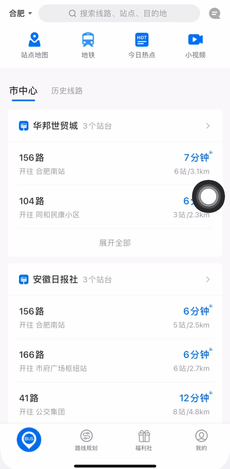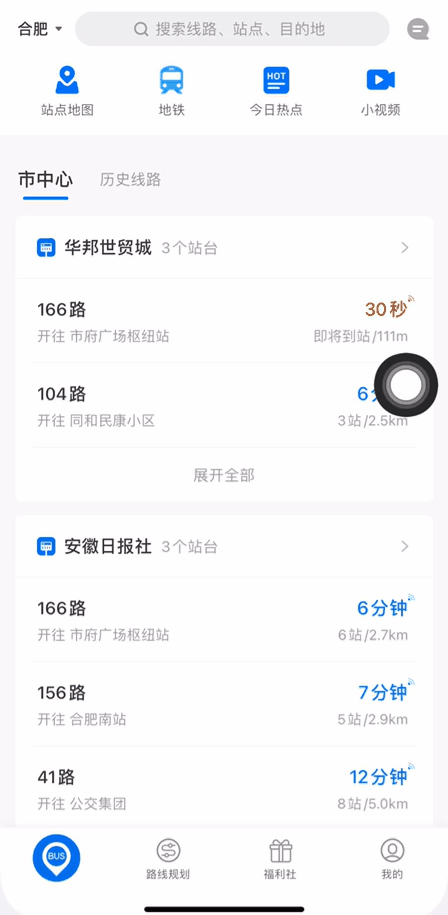 首先,打开车来了APP,定位到合肥,根据你所处的位置,APP首页就会显示附近的公交站点、对应的车辆和进站时间。