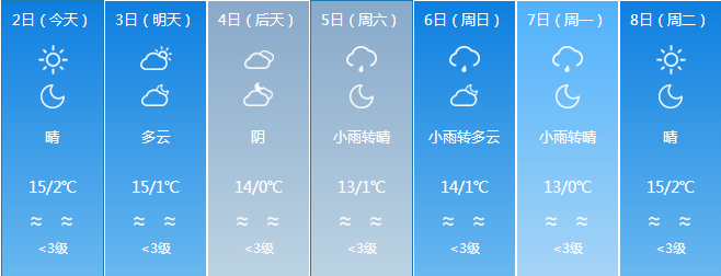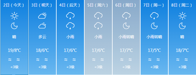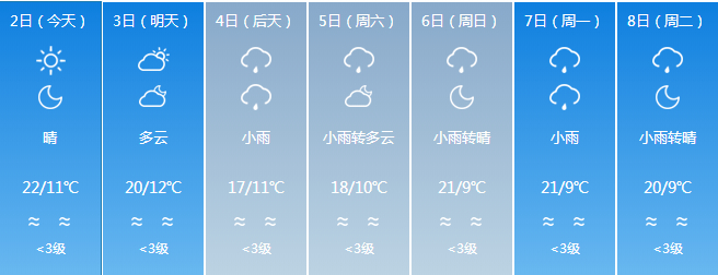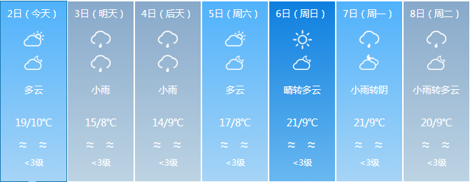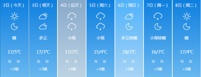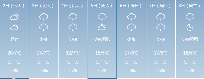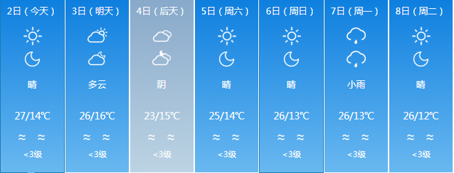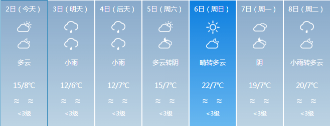 12月3-4日: 昭通北部阴有小雪、迪庆、怒江北部多云有阵雪局部中雪,昭通南部、曲靖、昆明、楚雄、玉溪、文山、红河、普洱、西双版纳、临沧、怒江阴有小雨,其它地区多云局地有阵雨。 12月5-6日: 迪庆北部、怒江北部多云有阵雪,怒江南部、保山、德宏、临沧、普洱、昭通北部多云有阵雨,其它地区多云间晴。 | 具体天气预报 |
