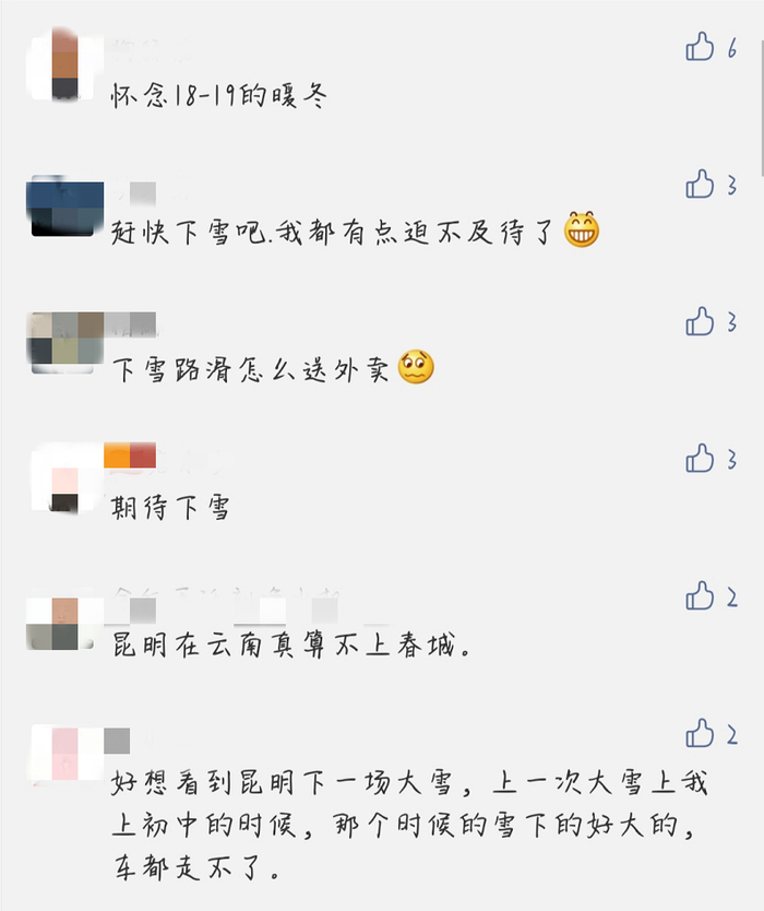 据@云南气象的消息:预计12月2日夜间-4日,受冷空气和弱南支槽影响,滇西北北部、滇东北北部阴冷有小雪局部中雪,滇东北南部、滇东、滇中、滇南阴有小雨,最高气温将下降6-8℃。