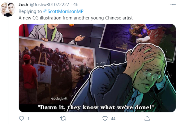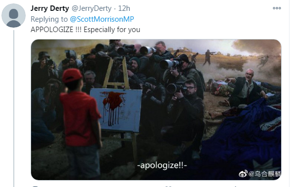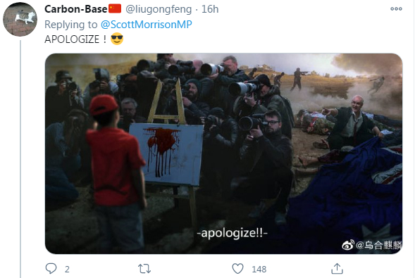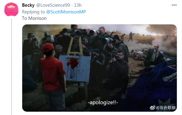 此前,“乌合麒麟”一幅有关澳大利亚士兵在阿富汗残杀少年的画作被中国外交部发言人赵立坚在推特转发,引发澳大利亚总理强烈抗议,并要求“中国道歉”。此事随后在国际社会和中国互联网激起舆论声浪。