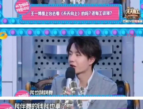 王一博之前在《天天向上》的存在感低到什么程度?很多网友都在说他是拿着工资在台上现场看《天天向上》。好在,王一博心态还不错,看到网友的质疑时不仅没被打击到,还能调侃自己不仅拿了主持人的钱,还拿了伴舞的那部分工资。