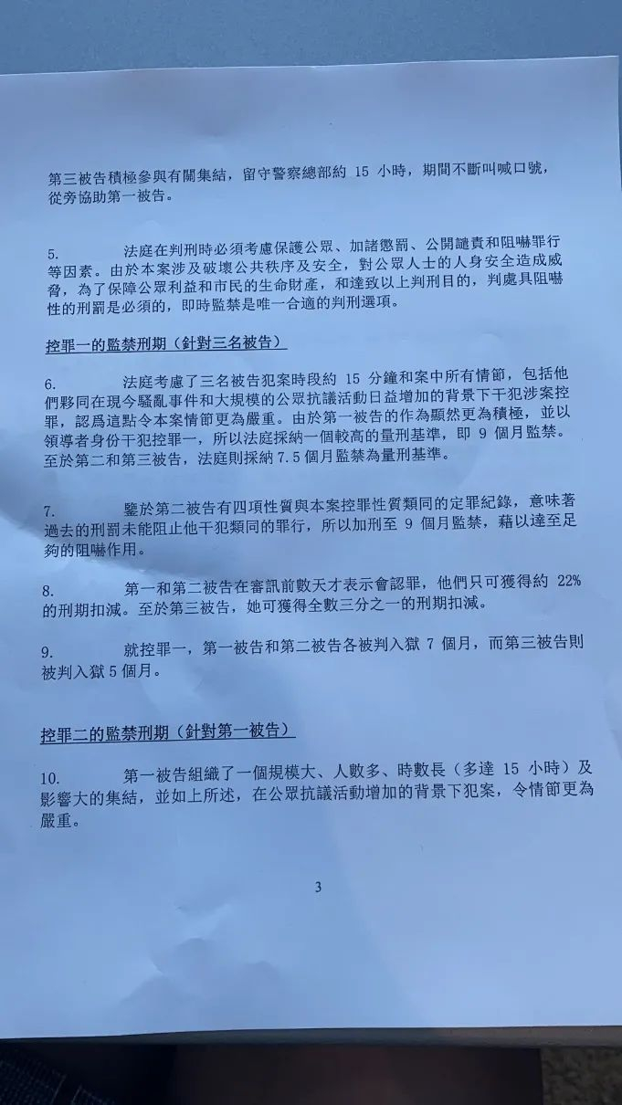 第三被告周庭(23岁)“煽惑他人明知而参与未经批准集结”罪、“明知而参与未经批准集结”罪两项罪成,判囚10个月。