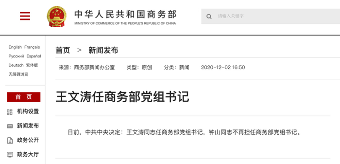 接连在上海、云南、江西、山东、黑龙江五个省份任职之后,黑龙江省省长王文涛进京履新,任商务部党组书记。