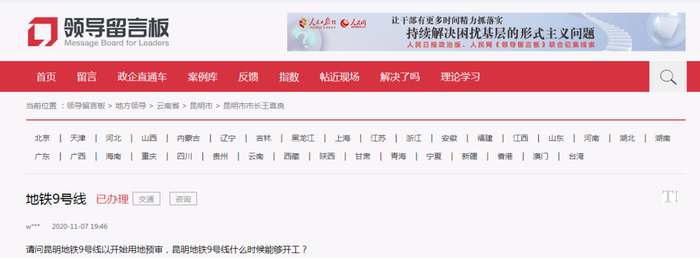 日前,有网友在人民网地方领导留言板咨询,昆明地铁9号线何时开工?