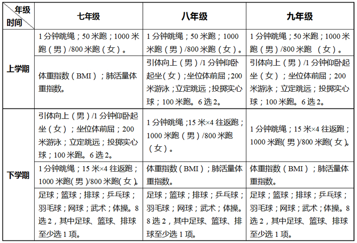 (三)体质健康监测项目由学校每学年组织测试1次,七年级测试数据作为基础数据(不计分),根据学生本人在七、八、九年级的测试数据进行纵向对比赋分,计入个人当年成绩。