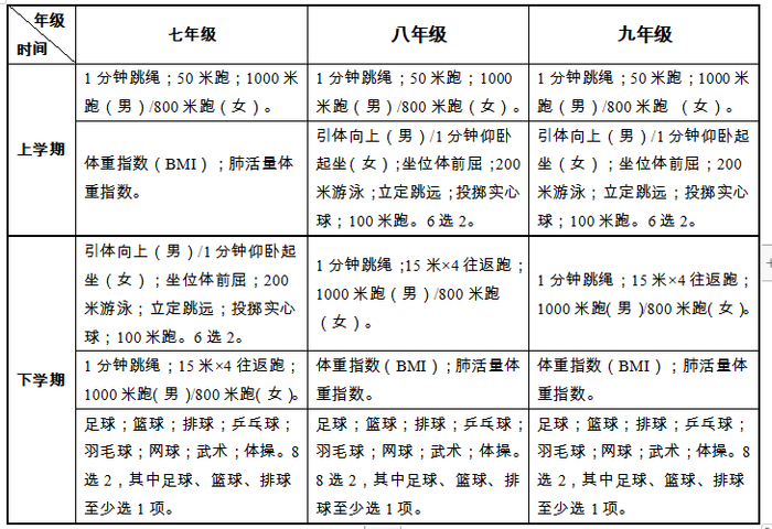 云南省初中学生体育考试方案