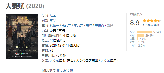 “豆瓣评分8.9”。作为《大秦》系列的收官之作,《大秦赋》再现厚重史诗,为期待已久的观众呈交了一份满意答卷。这部深耕细作的历史题材正剧,聚焦秦历史、展现秦文化、诉说秦风骨,激起无数人探索秦风秦韵秦文化的热情。剧中秦人的铮铮风骨和强劲秦风让不少西安人为之自豪,对于更好地挖掘、传承和发扬秦文化起到积极作用。